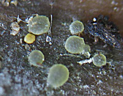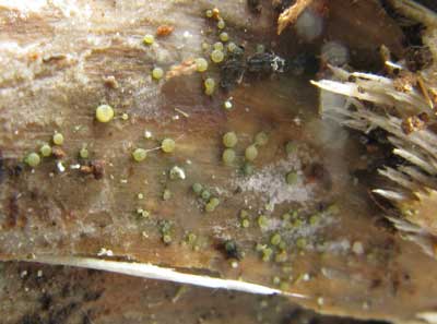 Bleekgroen Geleischijfje of Claussenomyces prasinulus op rottende takken en stronken van loofbomen.