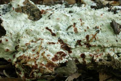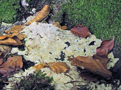 Bloedende Buisjeszwam of Physisporinus sanguinolentus, aan stronken en aan de onderzijde van op de grond liggende takken en stammen van loofbomen, o.a. wilg, populier, beuk.