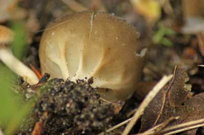 Bokaalkluifzwam of Helvella acetabulum, hoofdzakelijk bij eik.