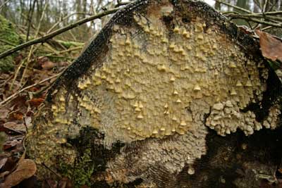 Na verloop van tijd is deze strookzwam herkenbaar aan de gele (citroen) kleur die op de zwam verschijnt. Aan de bovenkant vormen ze vaak een randje, het hoedje.