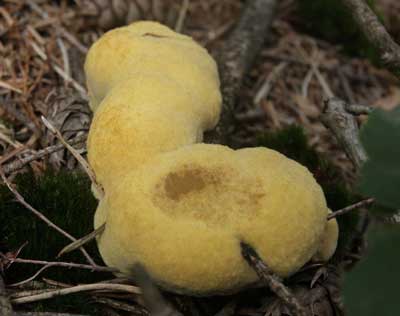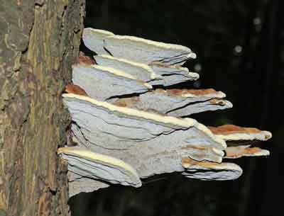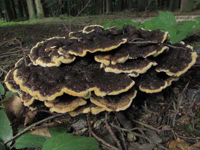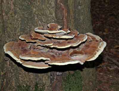 Dennenvoetzwam of Phaeolus schweinitzii, parasiet aan de voet of op de wortels van levende naaldbomen, ook wel op stronken van naaldbomen, met een voorkeur voor douglasspar.
