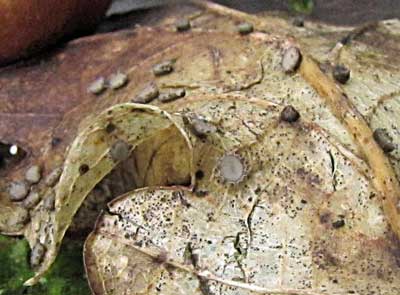 Eikenkronkelstafje of Coccomyces tumidus, deze vond ik achter op een eikenblad.