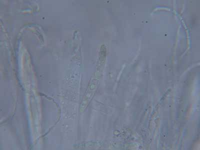 Eikenkronkelstafje of Coccomyces tumidus, deze vond ik achter op een eikenblad. De soort is door A v/d Berg op naam gebracht. De foto met de spore erop is gemaakt door S.Helleman Vindplaats: oktober 2010 Epe, landgoed Tongeren ascomyceten