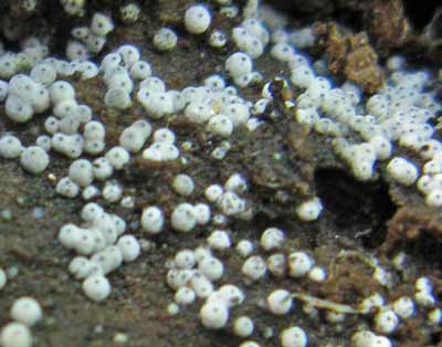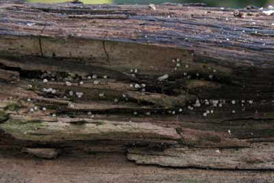 Eivormig ruigkogeltje of Lasiosphaeria ovina, op erg verrot hout.