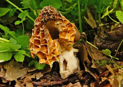 Gewone morielje of Morchella esculenta, op wortels van bomen, struiken en kruidachtige planten.
