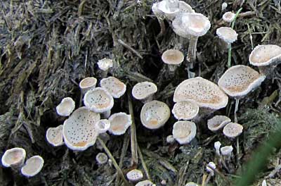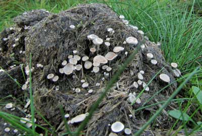 Grote speldenprikzwam of Poronia punctata, op mest van ( wilde) paarden, zelden ook van andere dieren als schaap.