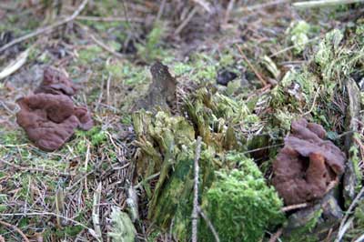 Grote Voorjaarsbekerzwam of Discina ancilis, vermoedelijk saprotroof, in naaldbos. In Rode Lijst als potentieel bedreigd wegens uiterst zeldzame voorkomen.