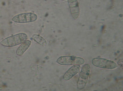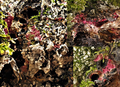 Hangende zwameter (anamorf) of Hypomyces rosellus, os substraat van plaatjeszwammen. In dit geval wrs. Oesterzwammen