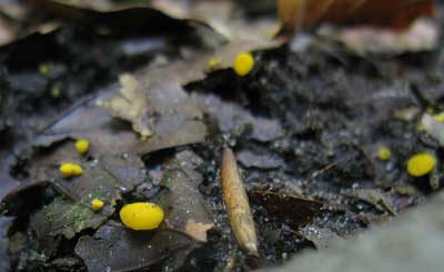 Heldergeel Donsschijfje of Calycellina punctata, op afgevallen blad van eik van het vorige jaar, zelden ook op afgevallen blad van beuk of esdoorn. Vindplaats: Augustus 2009 ascomyceten