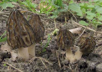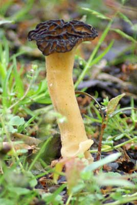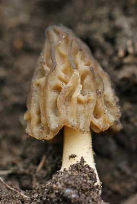 Kapjesmorielje of Mitrophora semilibera, op humeuze voedselrijke grond onder loofbomen.