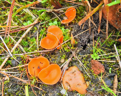 Kleine oranje bekerzwam of Aleuria exigua, op de bodem op brandplekken Vindplaats: Erebegraafplaats Loenen, november 2018 ascomyceten