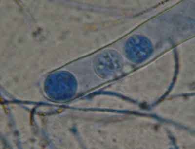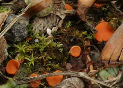 Klein moskussentje of Pulvinula haemastigma, tussen levende bladmossen onder loofbomen.