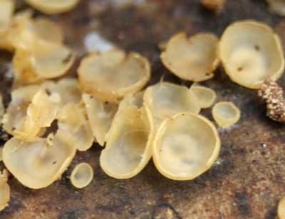 Kromsporig Wasbekertje of Orbilia auricolor, op dood loofhout. vindplaats: augustus 2007 ascomyceten