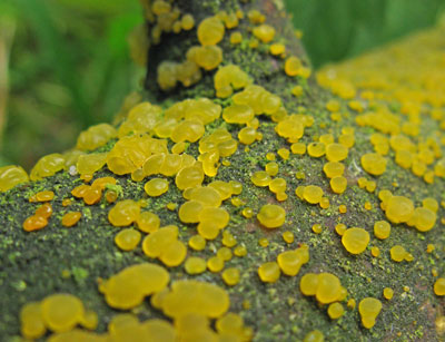 Oranje Druppelzwam of Dacrymyces stillatus, op vermolmde takken en stammen, ook wel bewerkt hout meestal van naaldbomen,