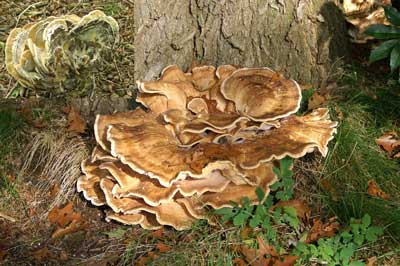 Reuzenzwam of Meripilus giganteus, parasiet aan de voet van oude loofbomen, op stronken of op begraven hout of wortels, meestal van beuk, soms van eik.