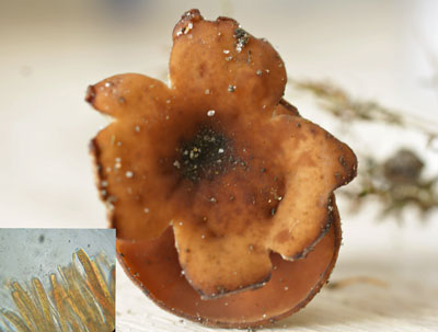 Salomonsstromabekertje of Stromatinia rapulum, parasiet op de wortelstokken van de welriekende salomonszegel. vindplaats: Brummen, Hallsepad april 2012 ascomyceten