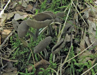 Schotelkluifzwam of Helvella macropus, in loofbos, vaak onder beuk of eik.