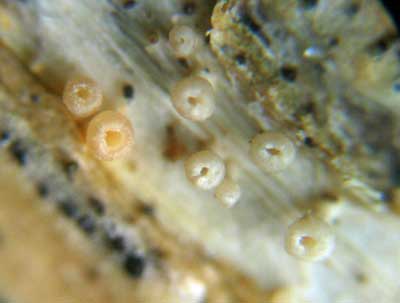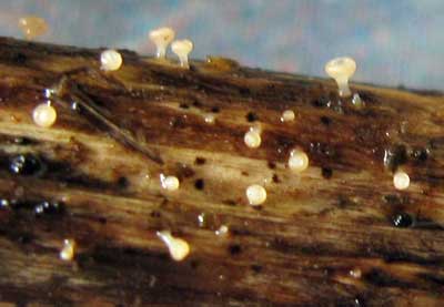 Slank Vlieskelkje of Hymenoscyphus repandus, op stengels van braam, harig wilgeroosje, en andere kruiden, soms op afgevallen bladeren, takjes of takken van loofbomen.