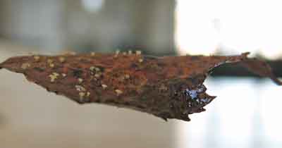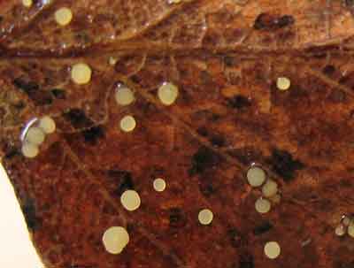 Vaalgeel vetsteelkelkje of Allophylaria byssacea, op kruidachtige plantendelen, riet, oevervegetatie en bladeren.