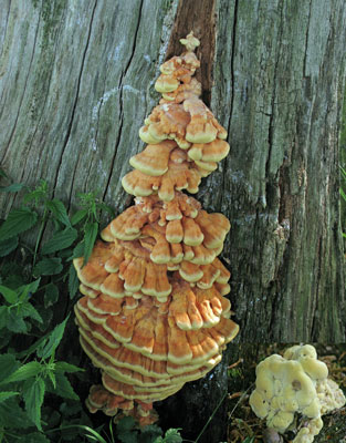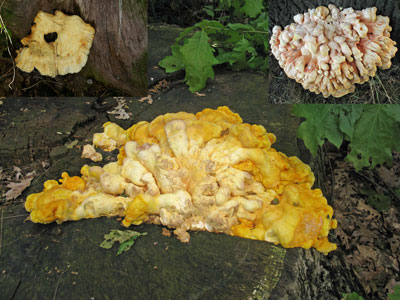 Zwavelzwam of Laetiporus sulphureus, parasiet op stammen en stronken, vaak op nog levende bomen,
